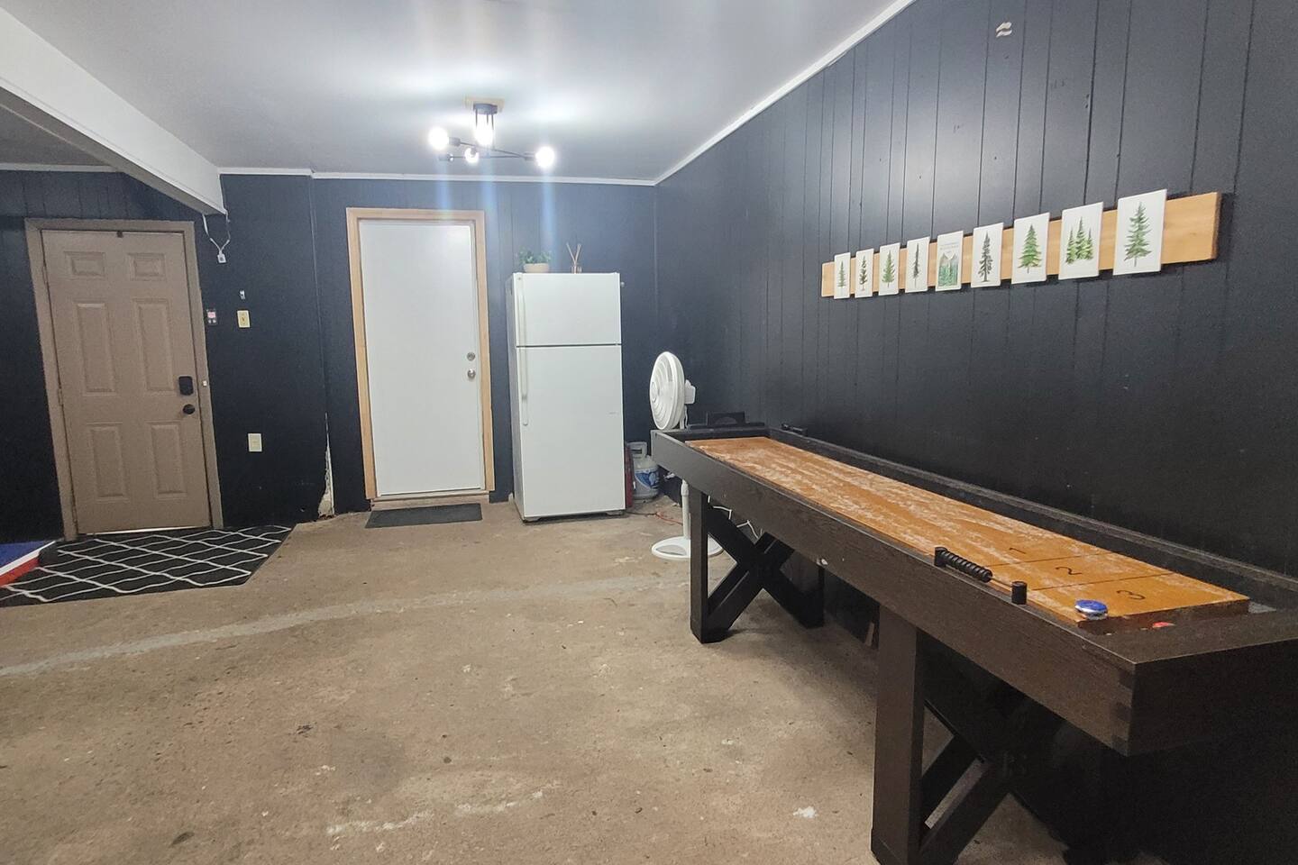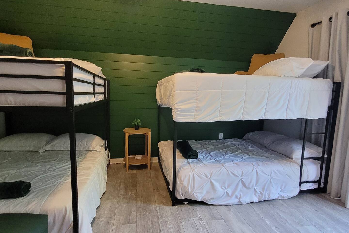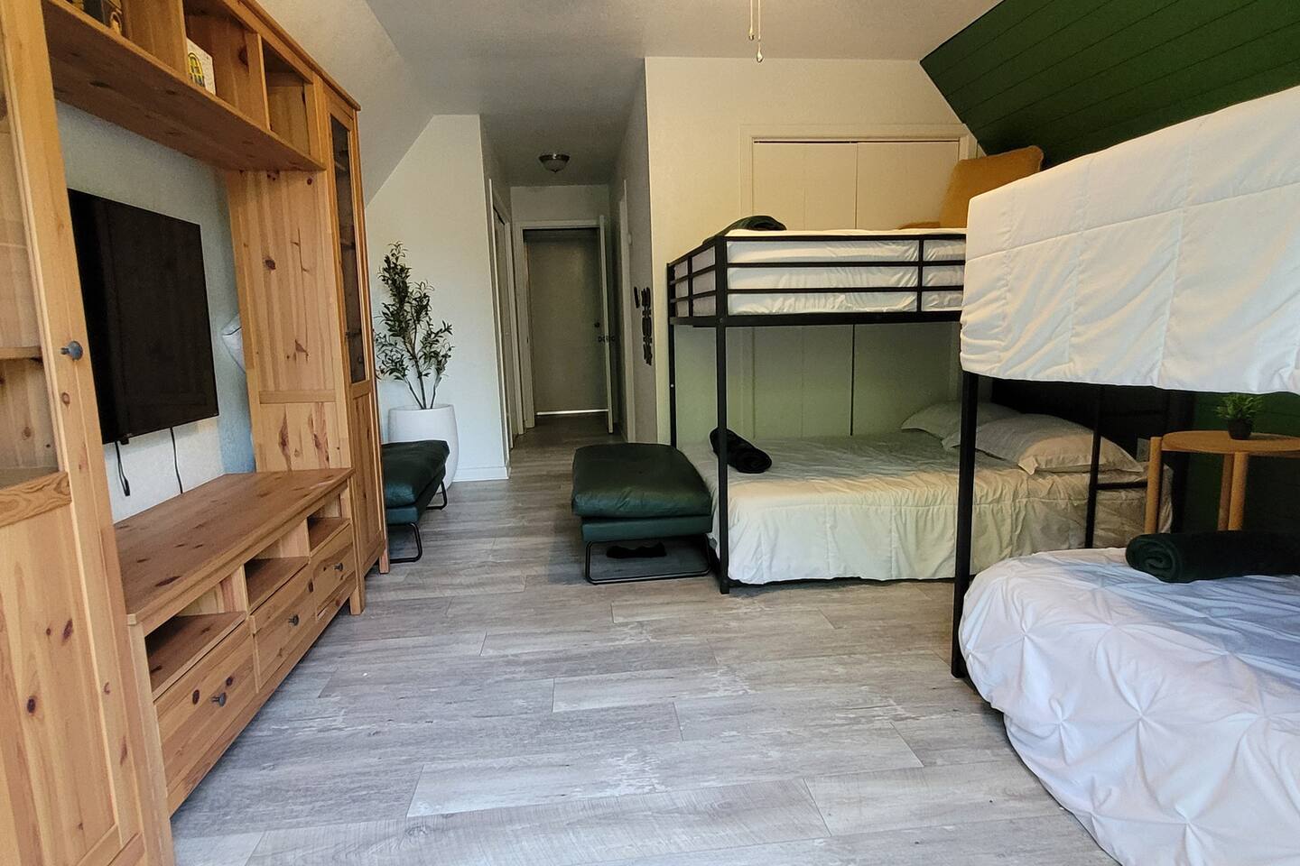 We love our home and hope you do too. It was built in 1983 and has been around for so many memories! Please know that we take a lot of pride in keeping our home an inviting place for guests. It is not new or perfect, but it is loved and we'd love the opportunity to share it with you! Living Room: Here you will find a couch, two chairs, a four seater bar top, 55in Roku TV and a fireplace w/electric insert. You will find a welcome table with a welcome binder. We'd love it if you'd sign our guest book and put a pin on the map to show where you're visiting from! Kitchen: Stocked 1983 kitchen with all the essentials for cooking and dining. The appliances are new! Everything functions, but the cabinets are not brand new. Dining Room: The dining room has a farm style table with two benches on each side. This table will comfortably seat 5 - 7 people. Bedroom One: This bedroom is located Downstairs off the living room hallway. It has a King size bed, two night stands, two lamps, a vanity/office desk, full length mirror, room darkening curtains, 55in Roku Tv, and a private electric fireplace. Bedroom Two: This bedroom is located Downstairs off the living room hallway. It has a Queen size bed, Li’l Pengyu Bedside Bassinet for Baby, dresser, vanity/office desk, two lamps, room darkening curtains, 55in Roku Tv, and a private electric fireplace. Bathroom One: This is between bedrooms one and two, has a bathtub/rain shower combo and a separate vanity area. Bedroom Three: This upstairs room has vaulted ceilings and large windows overlooking the backyard. Due to the uniqueness of this room we were unable to hang curtains; allowing the natural sunlight to flow in, in the mornings! We got creative with this room and decided on a Queen canopy bed allowing us to provide room darkening curtains to pull shut all around the bed. This room also features; a twin/twin day bed, 55in Roku Tv, private fireplace and bedside tables. Bedroom Four: This upstairs bedroom has two sets of full/full bunkbeds (these beds are suitable for adults, couples, and kids) a 55" Roku Tv, and cabinet with board games. This room has a private patio leading out to the second story deck. For this room we recommend keeping the room darkening curtains closed for temperature control. Bathroom Two: This upstairs bathroom is inside bedroom four. It has a jetted bathtub, rain shower, two sinks and a large mirror. Laundry Room: Here you'll find the stackable washer and dryer, iron, ironing board, mop, and broom. Garage: Make the most of your time here with a game of ping pong or shuffleboard. Do note that this space isn't climate-controlled. If you desire a fresher atmosphere, don't hesitate to raise the garage door. Just be aware that this might invite some bugs inside. While we're perfectly fine with tidying up after your visit, don't be surprised if a few insects make their way in due to the open doors. Outside: We have a backyard BBQ grill, pool, hot tub and above garage deck with patio furniture and propane firepit. Our front yard is tree filled and pretty. Pool: The pool's shallow end is 3.5 feet and the deep end reaches 6 feet. It remains accessible throughout the year, but it's important to be aware that it isn't heated (that's where the hot tub comes in!) A pool maintenance company takes care of cleaning and servicing the pool on a weekly basis. Please take note: Occasionally, leaves and insects may find their way into the pool due to its outdoor location. This is a common occurrence and doesn't indicate a lack of maintenance or cleanliness; in fact, it can happen shortly after the pool company's visit. We provide a pool net for your convenience, allowing you to remove any debris as needed or desired. The host is not liable for any injury sustained on the property or around the pool. Please stay at least 10 feet away from the edge of the pool at all times when not getting in to swim. The concrete can be slippery when wet. Do not run on the concrete around the pool. For your safety it is not advised to drink alcohol near the pool. These warnings are required by Airbnb. Hot Tub: Our hot tub receives weekly cleaning and servicing. To ensure optimal temperature and prevent motor strain, please remember to keep the cover on when the hot tub is not in use. Do not turn the hot tub off. Your enjoyment and the longevity of our amenities are our priorities.