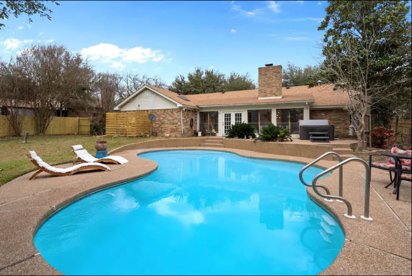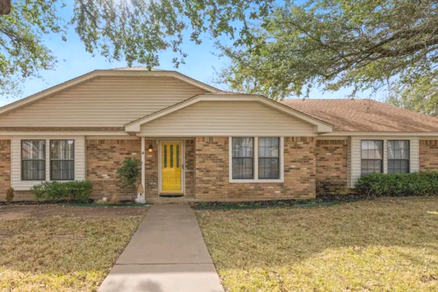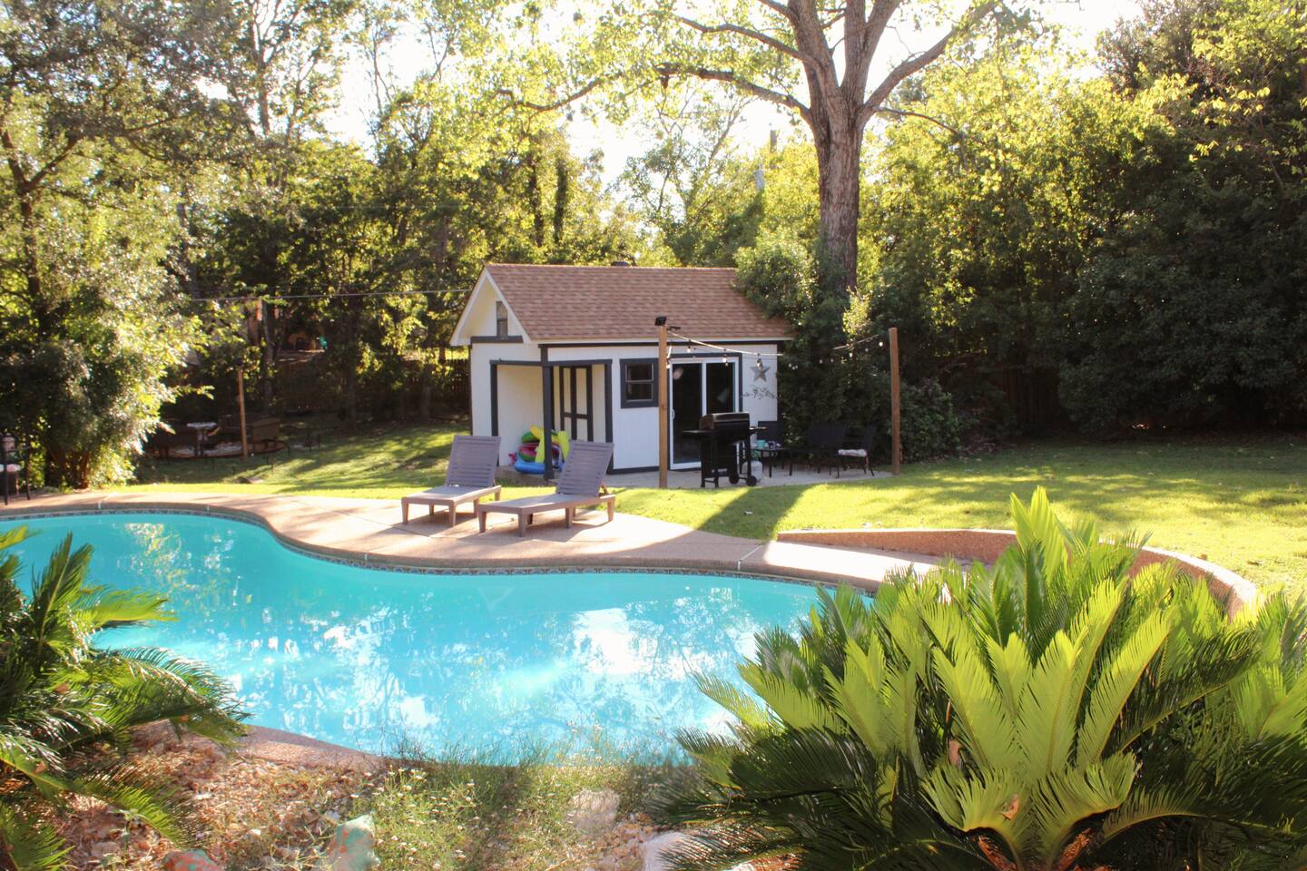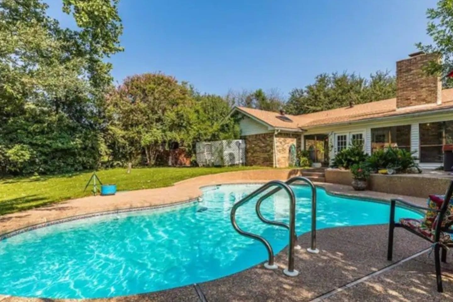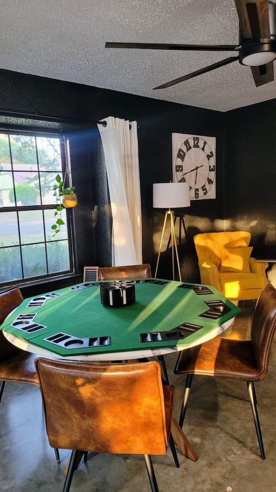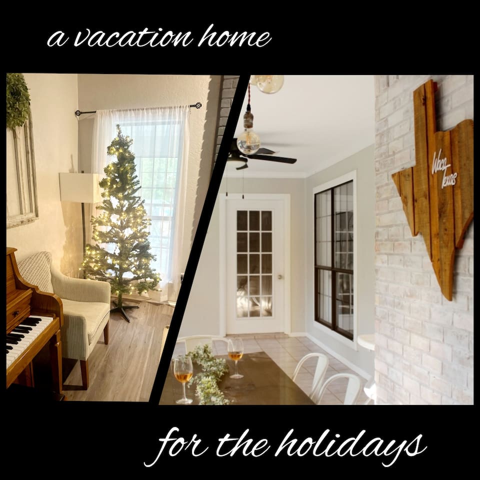 Welcome to Texas Sunshine Oasis! This single level brick house was built in 1983 and is on 1/2 acre in a quiet neighborhood. We loved it at first sight due to the sunroom and the greenery-filled back yard! It is not new or perfect, but many memories have been made here. Special features: - In ground pool (3.5 feet in the shallow end, 8.5 feet in the deep end) - Shed turned into playhouse just for fun. - Garage turned into game room for ping pong and poker. - Piano in the living room! - Fully stocked kitchen Bedrooms & Bed types: - 1st Bedroom: Two Queen beds - 2nd Bedroom: King bed - 3rd Bedroom: Two Twin beds and two Full sized beds (two twin/full bunkbeds) Bathrooms: - Full Bathroom: Attached to 1st bedroom. Has two vanities, two walk in closets, toilet and large shower. - Full Bathroom: Shared by bedrooms two and three, with a bathtub/shower combo. - 1/2 Bathroom: Toilet and sink (no shower or bathtub) Other Spaces: - 1st Living Room: Small desk, Board game shelf, cloth "closet," Trundle bed with two twin mattresses. - 2nd Living Room: Large couch, TV, Piano, Coffee Table, Decorative Fireplace (note - decorative only - not suitable for actual fires.) - Laundry Room: Washer and Dryer. - Garage: Ping Pong Table, Poker Table - Outdoor Shed: Playhouse